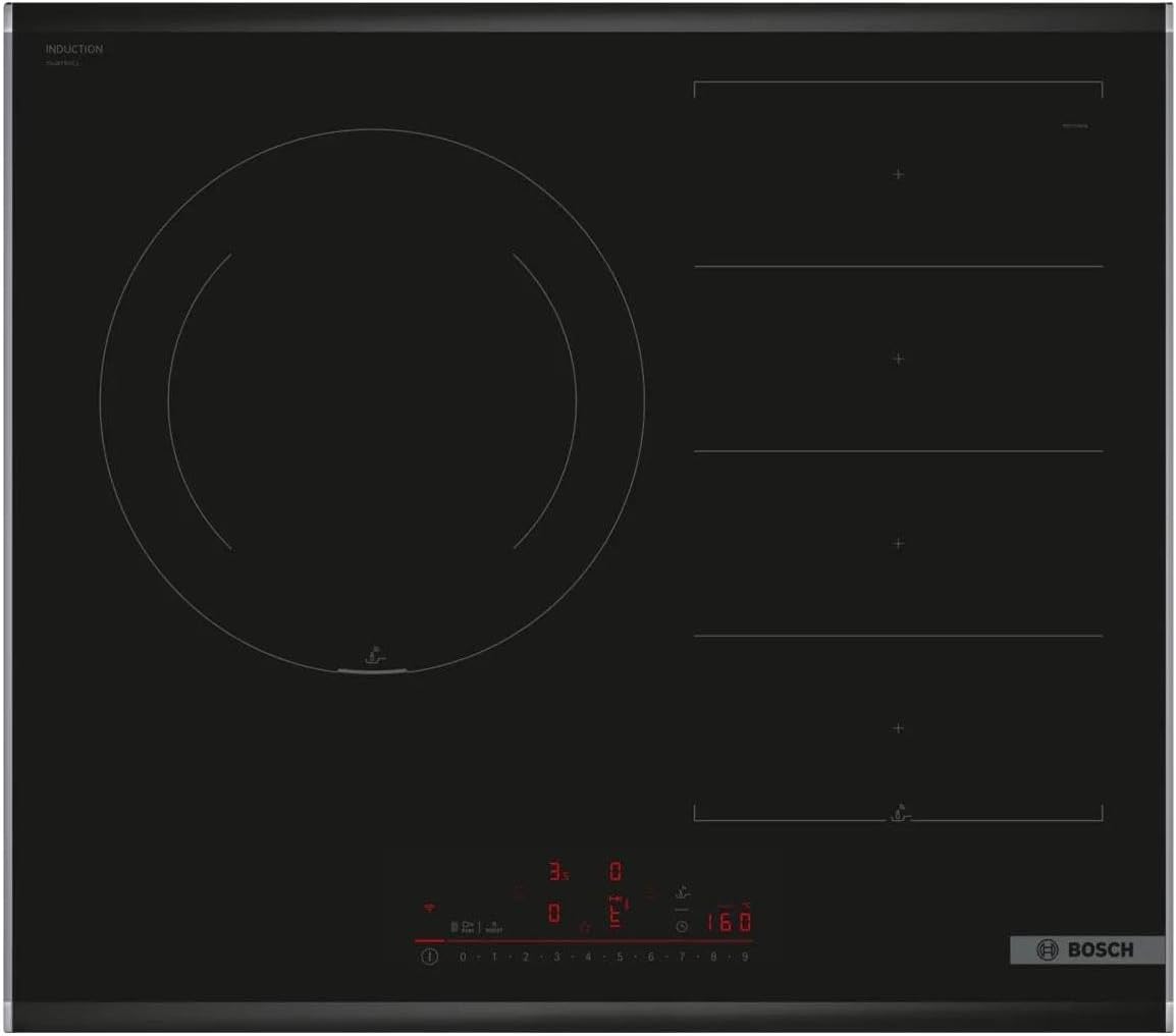 • BOSCH Induction Hob, 60 cm, Series 6, FlexiInduction und Zone 28 cm, Electronics DirectSelect, PerfectFry Plus, Home Connect, Bluck, PXJ675HC1E